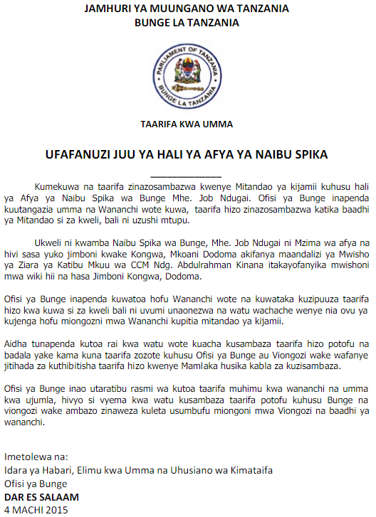 HABARI KWA UMMA KUHUSU AFYA YA NAIBU SPIKA WA BUNGE LA TANZANIA